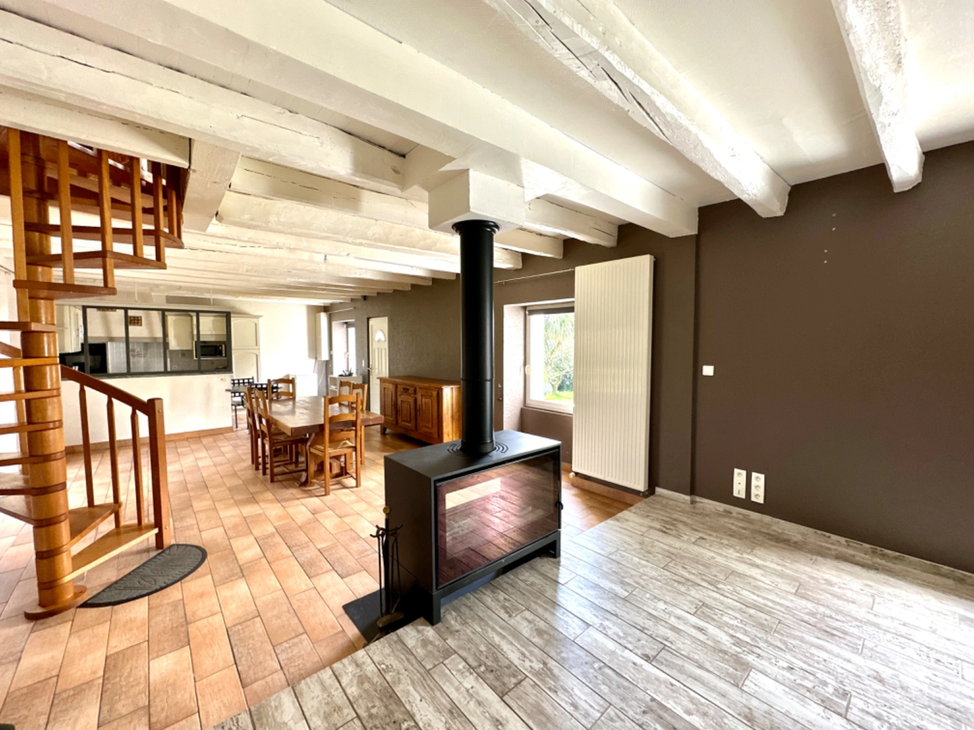 Spacieuse pièce de vie de 60 m² baignée de lumière, agrémentée d’un poêle à bois.